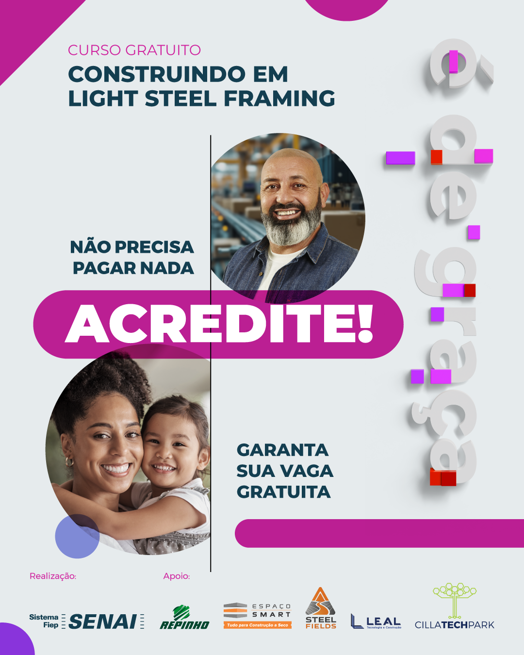 As inscrições são gratuitas e devem ser feitas pelo link: https://alunos.sesisenaipr.org.br/framehtml/web/app/Edu/PortalProcessoSeletivo/?c=3&f=3021&ct=10963&ps=12974&utm_campaign=Curso%20Light%20Steel%20Framing&utm_source=flyer&utm_medium=impressa&utm_content=Curso%20Light%20Steel%20Framing#/es/informacoes.